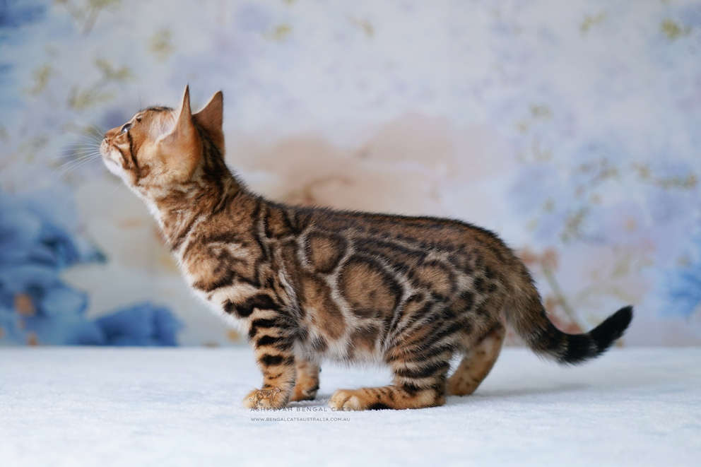 Our breeding program focuses on producing exceptional Bengal kittens with strong structure, correct type, and outstanding coats. At Ashmiyah, we are especially known for our rare, clear-coated Brown spotted/rosetted Bengals, prized for their rich colour, sharp contrast, and breathtaking wildcat appearance.